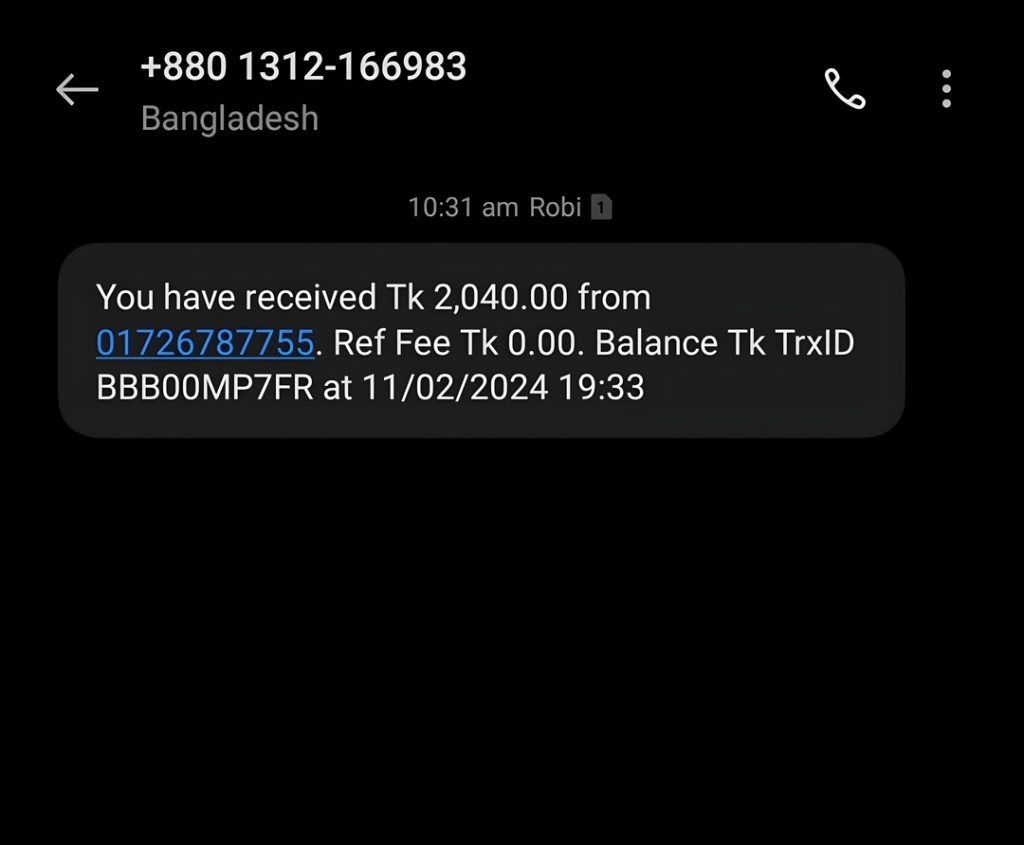 প্রোডাক্ট অর্ডার করার কথা বলে অ্যাডভান্স করার জন্য বিকাশ নাম্বার চায়। সেই নাম্বারে আগে থেকে কপি করা বিকাশের রিসিভড-মানির একটা মেসেজ পাঠায়। মেসেজটা দেখলে ভাববেন টাকা এসেছে, খেয়াল করলে দেখবেন মেসেজটা আসলে বিকাশ থেকেই আসে নি।