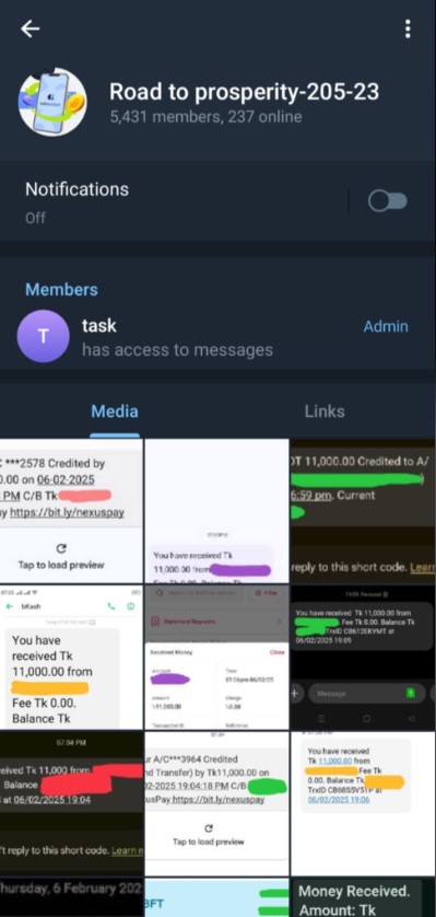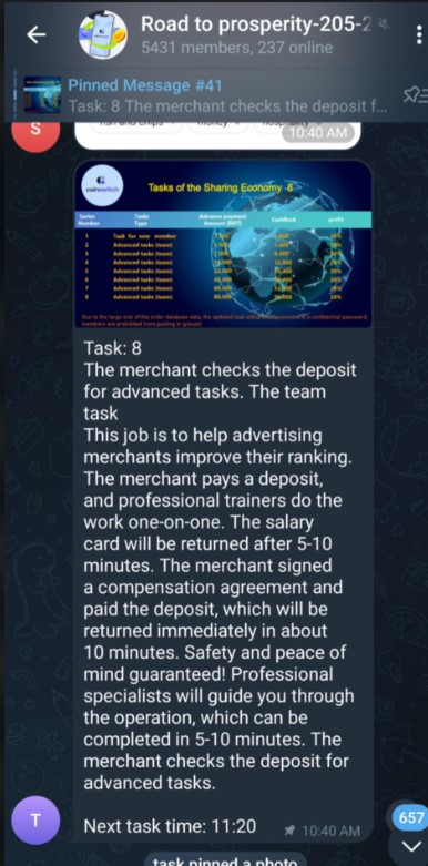 এরপর তারা আমাকে একটি টেলিগ্রাম গ্রুপে Group Name: Road to prosperity-205-23 (https://t.me/+QANgODOo1ZJjYjhk) যোগ দিতে বলে এবং একজনের সাথে যোগাযোগ করতে বলে (https://t.me/sharmin_159)। গ্রুপে ৫০০০ এর মতো মেম্বার ছিল এবং প্রতিদিন ২৪ টাকা করে টাস্ক দেওয়া হতো।
