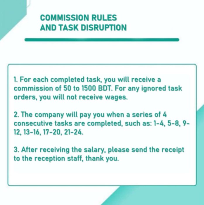 এরপর তারা আমাকে আরও টাস্ক দেওয়া শুরু করে। ৫ম, ৬ষ্ঠ এবং ৭ম টাস্ক কমপ্লিট করার পর তারা আমাকে ৮ম টাস্কে ১৫০০ টাকা ইনভেস্ট করতে বলে। গ্রুপের অন্যান্য সদস্যদের কথোপকথন ও স্ক্রিনশট দেখে মনে হচ্ছিল সবাই নিয়মিত টাকা পাচ্ছে। তারা বিভিন্ন পরিমাণের ইনভেস্টমেন্ট করছিল এবং লাভজনক রিটার্ন পাচ্ছিল। এরপর তারা আমাকে ১৫০০ টাকা ইনভেস্ট করতে বলে। আমি তা করি।