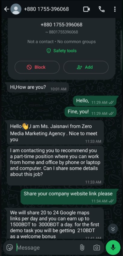 আমি সম্প্রতি একটি অপরিচিত নম্বর (01755396068) থেকে হোয়াটসঅ্যাপে একটি মেসেজ পাই। সেখানে আমাকে গুগল ম্যাপ রিভিউয়ের কাজ করার প্রস্তাব দেওয়া হয় এবং প্রথম টেস্ট রিভিউ সম্পন্ন করার পর ২১০ টাকা বোনাস দেওয়া হয়।