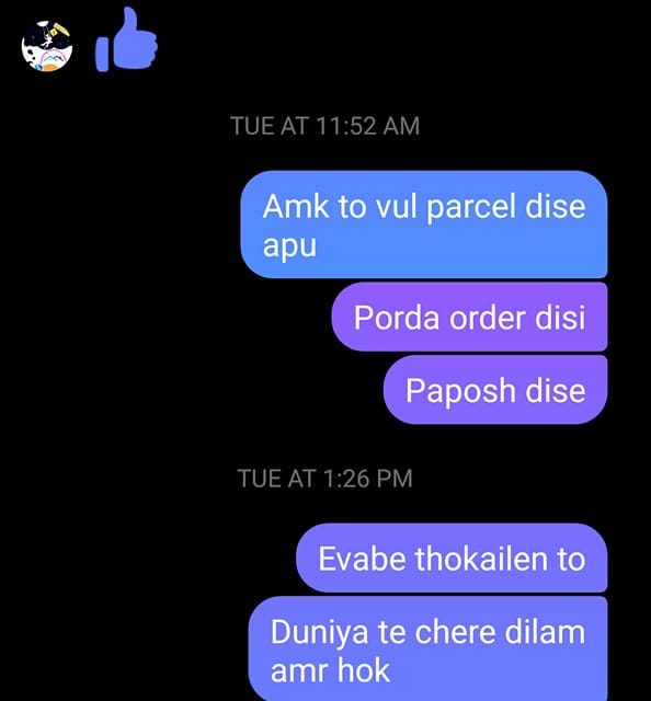 Ami goto porshu enader page e 7 piece curtain order kori.. Amk 400 tk bkash korte bole order confirm korte..total bill ashe 2700 tk..tara amk bole bashai home delivery kora hobe.. Kintu SA Paribahan currier centre theke amk call diye bole kakrail eshe unader theke parcel recieve korte… Ami sathe sathe page e knock dei..apnara bolsilen home delivery kora hobe.. Delivery charge o nise tar upor 100 tk.. Unara just bole kaoke pathai diye niye ashen instead of apologising. Jakge pordin ami kakrail gelam 100 tk rickshaw bhara diye… Baki 2300 tk payment korar por tara amk parcel dilo…shob number milayei disen onara amr shamne…ami parcel ta khule check korte chai…kintu atto tight shelai dewa chilo.. Kachi chara remove kora shomvob na…amio pore bashai chole ashi…vablam ato bochor online shopping kori kokhono deceived hoini…ebaro hobo na…bashai ashlam abar 100 tk rickshaw bhara diye. Eshe parcel open kori.. Dekhi pordar jaigai nimno maner 4 ta paposh dewa jar dam 200 tk o na….ami tader inbox kori sathe sathe… Kono response nai…call dei..number busy dekhai.. Khanik bade bujhlam they blocked me from everywhereÂ