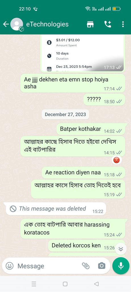 পোস্ট boosting এর জন্য টোটাল ১৬৮০টাকা দিয়েছি আমি এই fraud and Batper marketing এজেন্সী কে।boosting অফ করে দিচ্ছে তারপর আবার টাকা রিটার্ন চাওয়াতে খারাপ কথা বইলা আবার deleted ও করে দিচ্ছে। এমন করে কত উদ্যোক্তা থেকে যে টাকা মেরে খাইসে আল্লাহ ভালো জানে। তাই আমি চাচ্ছি এই page তে কে রিপোর্ট মারেন এন্ড নস্ট করে দেন।
