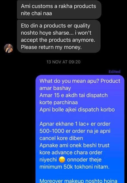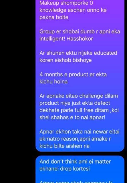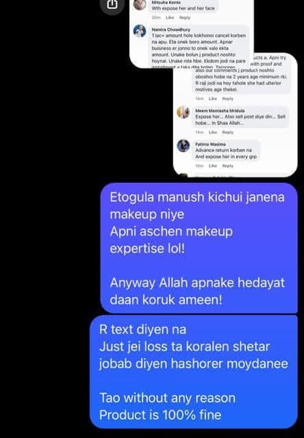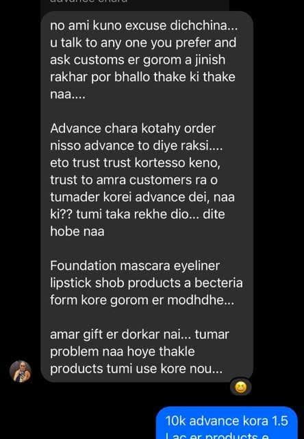 Uni 20k advance kore 1.5 lac takar makeup order kore. Uni amake promise korechilo kichudin pore baki advance kore diben but ei batpar mohila shuru thekei 1 number er bhondo giri kore geche,amar kache er ageo shein sheglam order kore almost 60k er and tokhon o uni 1.5 months products niye ghurai,eid er time chilo,onek request koreo payment koreni.