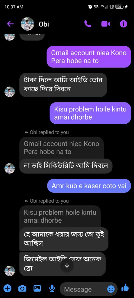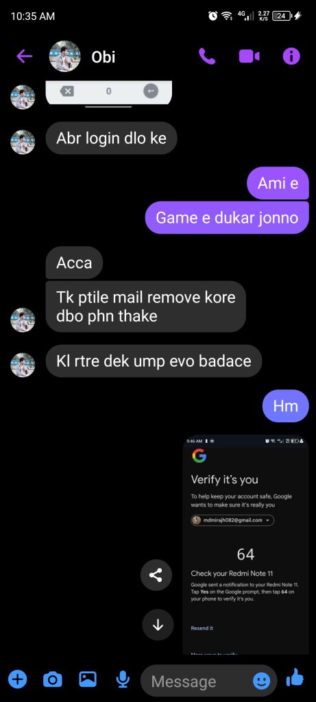 ভাই ওই ছেলে আমার দেড় বছরের পরিচিত, বন্দী পাঠশালা এর অনলাইন গ্রুপে পরিচয় হয়েছিল, তো কিছুদিন আগে ওই ছেলে আমায় এসএমএস দিয়ে বলছে যে ফ্রী ফায়ার আইডি বিক্রি করবে তো আমি বললাম আমার এক ছোট ভাই নিবে তো আমায় বলল যে ১৫০০ টাকা দেবে আসবে একটু পরে ফাইনাল হলো যে ১২৫০ টাকা পরে আমায় ওই ছেলে জিমেইল আইডি আর পাসওয়ার্ড দেয়ার পরে আমি জিমেইলের নাম্বার চেঞ্জ করবো তো ওর কাছে কোড গেল ও বলল যে টাকা দেয়ার পরেই করতে আমার ফ্রেন্ড বলে আমি বিশ্বাস করে টাকা দিয়ে দিলাম তার সাথে সাথে ও আবার জিমেইলের পাসওয়ার্ড চেঞ্জ করে আর আমার নাম্বার ব্লক করে দিছে আর ফেসবুক থেকে আমায় আনফ্রেন্ড করে দিছে অন্য কোন নাম্বার থেকে কল দিলে কল ধরছেনা