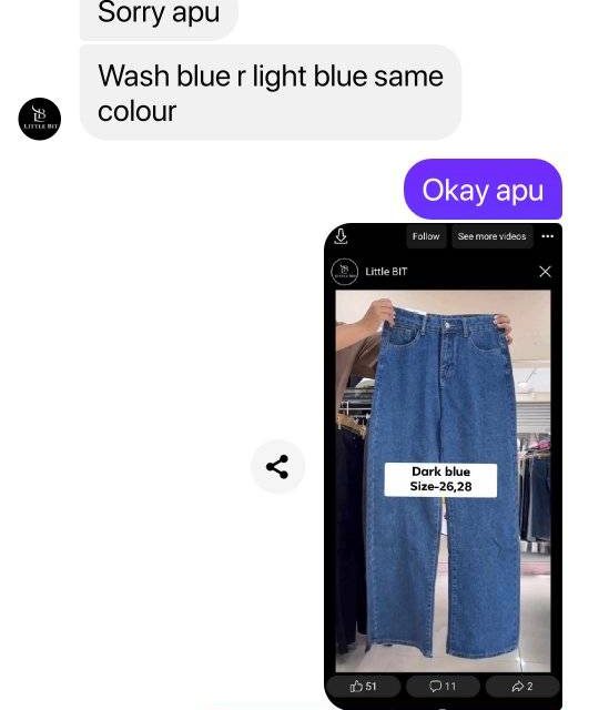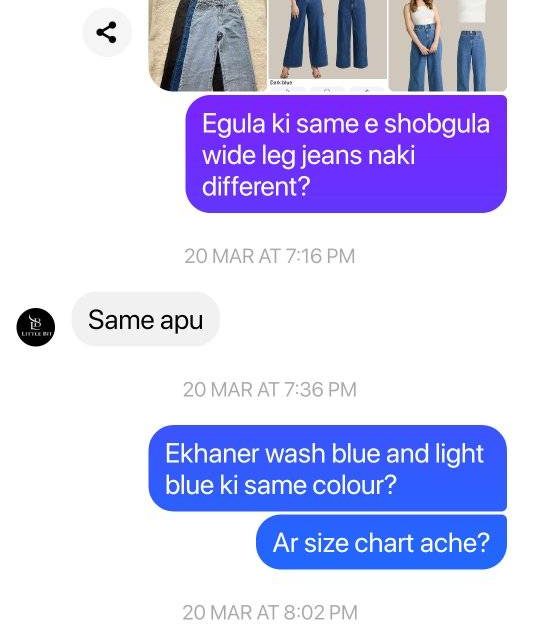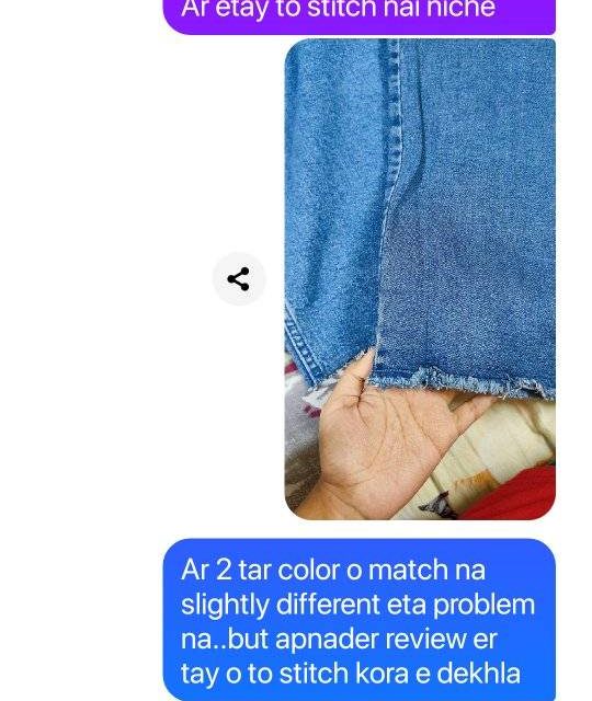 Ora picture e ekta jeans dekhay pathaise arekta..same jeans order kora hoisilo 2 ta but color o match kore na length o match kore na ar jeans puratai totally different. .tarpor oder bolay kono response kore na..seen kore falay rakhe msg number o block kore rakhe kono professionalism nai block kore dey page theke..amr bon order korechilo ei page theke..Don’t order from this fraud page apu ra