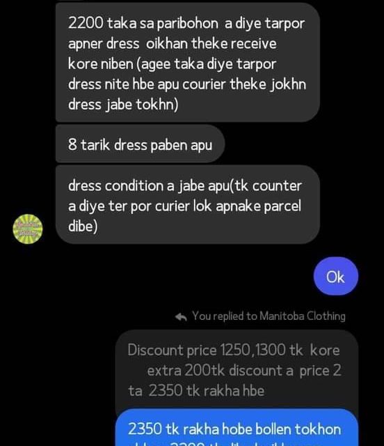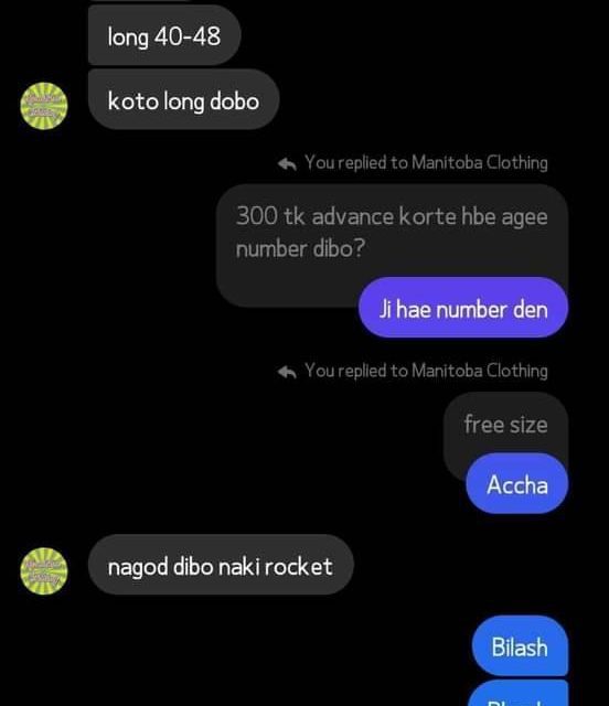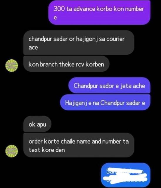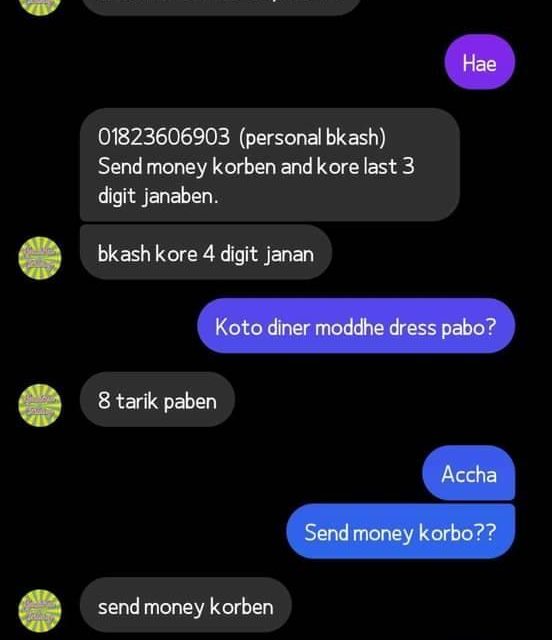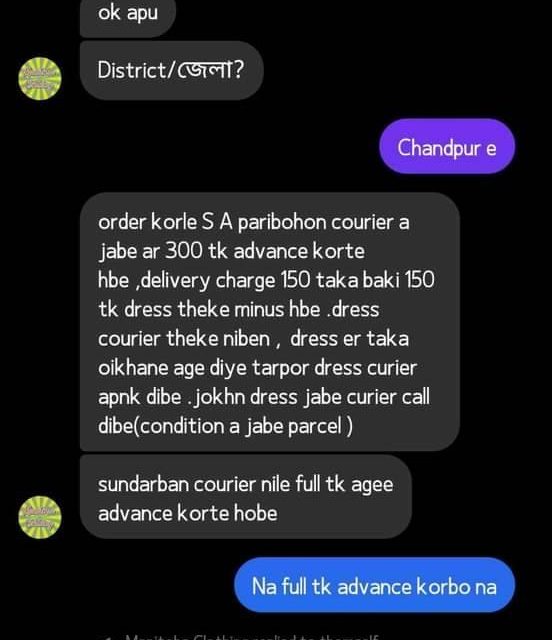 এই আপু বললো এডভান্স দিতে হবে! ৩০০/- টাকা এডভান্স দেয়ার পর প্রোডাক্ট পাবে! যাইহোক আগে কখনো কোন পেজ থেকে কিছু কিনলে এডভান্স দেয়নি কিন্তু উনাকে বিশ্বাস করে ৩০০/- টাকা এডভান্স দেয়ার পর ডেলিভারি দেয় অন্য প্রডাক্ট! পরে তাদের কল দেওয়া হয় ওনারা মেমো কার্ড দেখতে চাওয়ায় মেমো কার্ড এর ছবি দেওয়া হয়। আপু পরে বলেন যে প্রডাক্ট কাল সকাল ১১টায় দিয়ে দেওয়া হবে ঠিকানা অনুযায়ী। কিন্তু পরের দিন সকালে মেসেজের দেওয়ার পর রিপ্লাই তো দিলোই না উল্টো ব্লক করে দেয়……!!