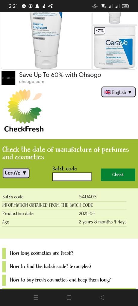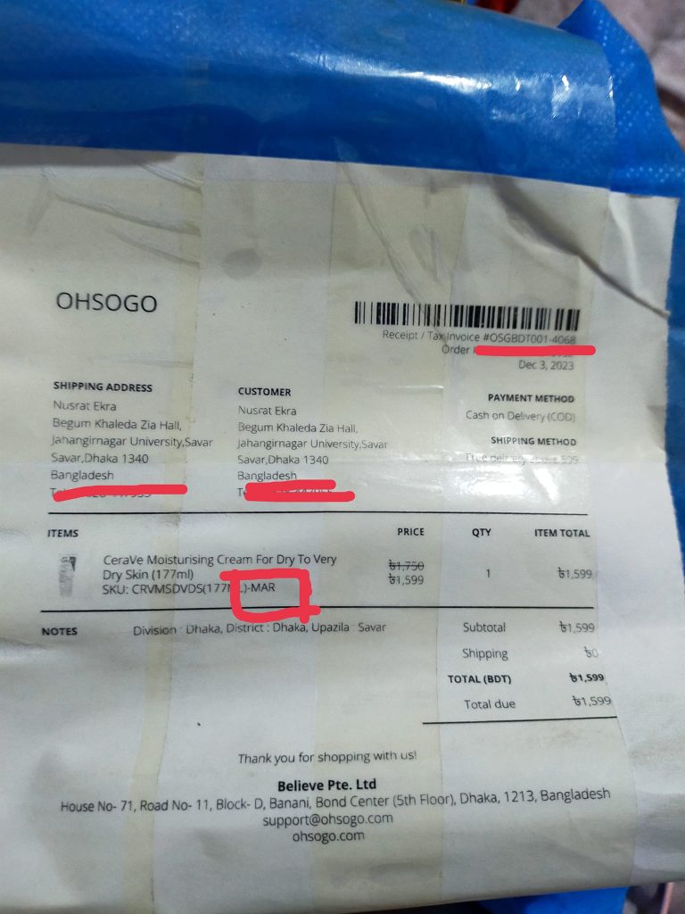 যার ডেলিভারি পাই ৫ তারিখে।হলের নিচে ওয়াইফাই না থাকায় রুমে এসে সাথে সাথেই ব্যাচ নাম্বার দিয়ে ম্যানুফ্যাকচারিং ডেইট চেক করি। তখন দেখি এটার উৎপাদন এপ্রিল,২০২১ এ। যেখানে সেরাভির সেল্ফ লাইফ ৩ বছর থাকে। তারমানে ওরা আমাকে সে প্রোডাক্টটি দিয়েছে সেটার আর মাত্র ৪ মাস মেয়াদ ও বাকি নেই।