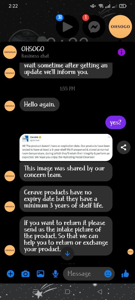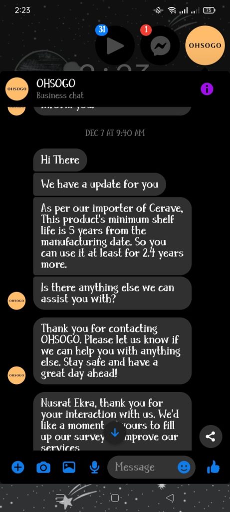 গত ৩ তারিখে আমি OHSOGO থেকে একটা cerave moisturizing cream 177 ml অর্ডার করি।