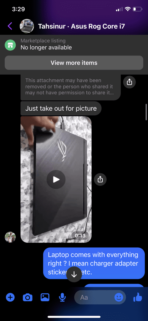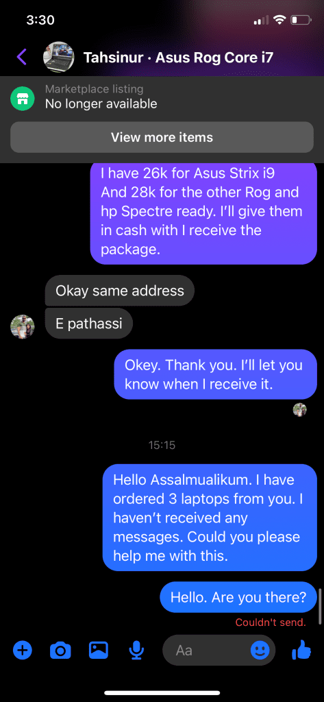 Long story short, I tried to buy some laptops via Facebook market and paid this person lots of money as delivery charge fee. Later I got no product. When I tried to contact him his Facebook market profile was gone. I realised it was a scam