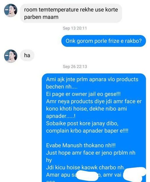 Era fake jinis beche….apnar skin khrp kore dibe…ami amr taka return korte bolsi ora amr msz eu dekhe na…koyekdin aghe ami comment kore ei mohilar asol rup dekhate caisi amk ora block korse…onno id thike msz deyay reply paisi…abr se id diye jokhon amr taka ferot dite bolsi er ami bolsi sobar kse bole dibo amr id block kore. Ottonto khrp ei mohila er tar products