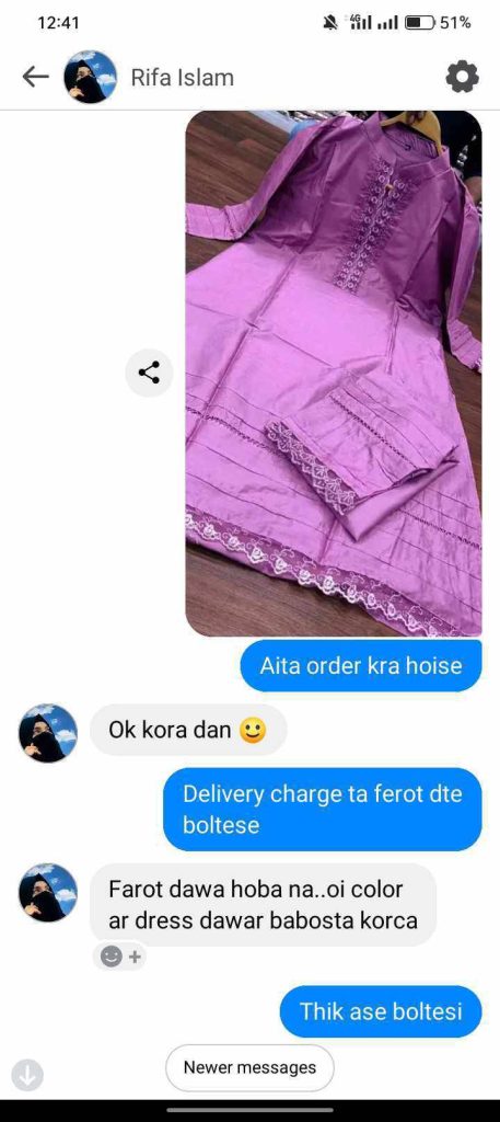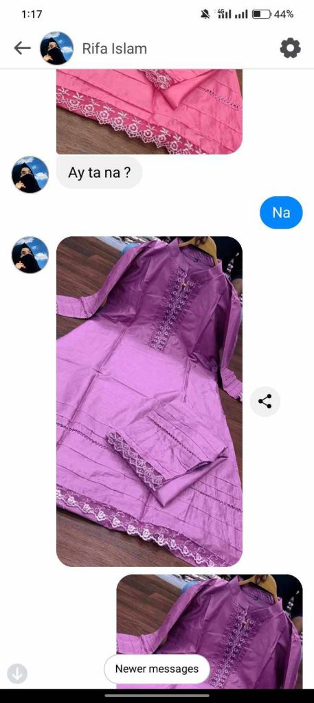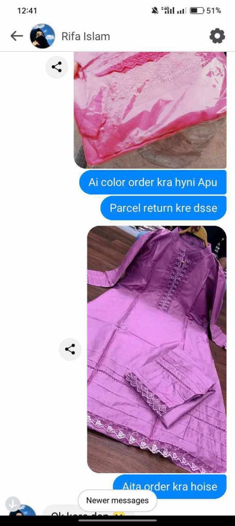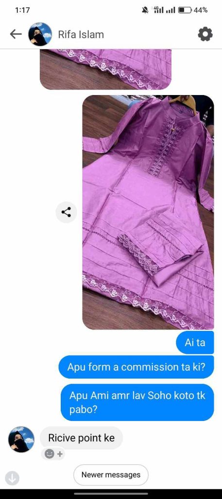 আমি বিশ্বাস করে টাকা দিয়ে জয়েন হই। তারপর একটা কাস্টমার পাই, কাস্টমার বেগুনি রঙের একটা জামা অর্ডার করে কিন্তু তারা গোলাপি রঙের জামা দিয়ে দেয়, তখন কাস্টমার জামা রিটার্ন করে দেয়। তখন তারা বলে এটাই বেগুনির একটা কালার । আবার বলে কাস্টমার রং এডিট করে ছবি দিয়েছে।