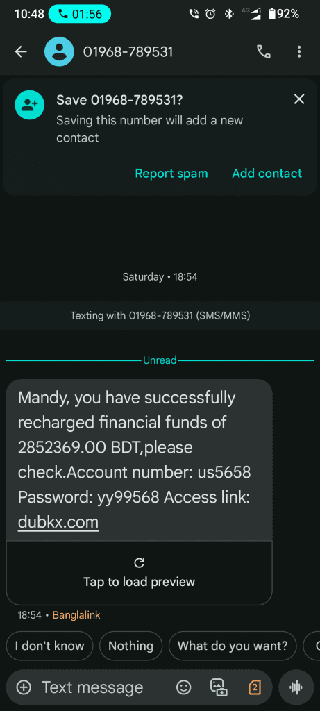 I received an SMS from 01968-789531 stating that “Mandy, you have successfully recharged financial funds of 2852369.00 BDT, please check. Account number: us5658, Password: yy99568, Access link: dubkx.com”.