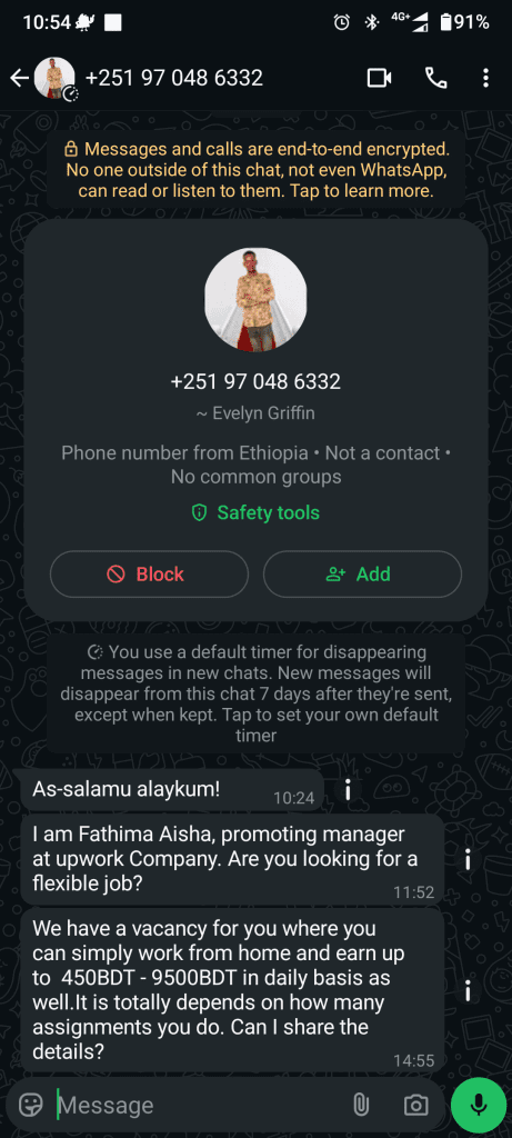 Later, I received a WhatsApp message from an unknown number with Ethiopia code (+251) claiming to be “Fathima Aisha, promoting manager at Upwork Company”, offering fake job opportunities and claiming I could earn 450–9500 BDT per day.