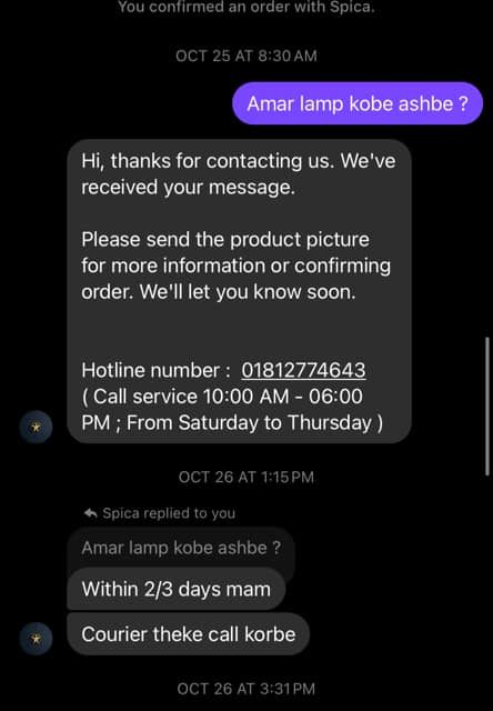 Please be careful before ordering something online, specially if there are no reviews or if they’re asking for an advance. I recently found this page called Spica and I ordered a lamp from them, paid them 40% advance because apparently I must pay in advance to confirm my order. I haven’t got my product yet and they keep giving me excuses and eventually stopped receiving my calls.